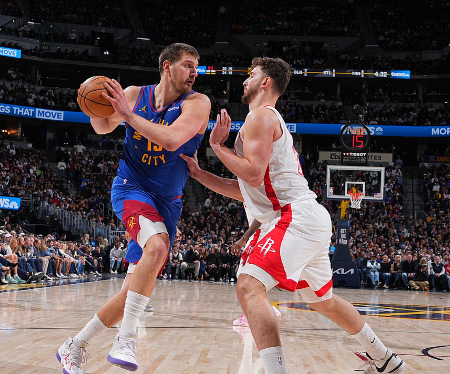 火箭客场挑战掘金,火箭是背靠背作战(昨日击败猛龙),火箭方面范弗利特、亚当斯、芬尼史密斯缺阵,掘金方面沃特森缺阵,首节比赛掘金取得4分领先,第二节火箭一度反超比分,随后掘金又重新取得领先,半场战罢掘金领先6分,第三节掘金打出强势表现,单节赢了18分,三节战罢掘金领先24分,第四节掘金快速把分差扩大到30分以上,比赛悬念就此失去,最终掘金129-93大胜火箭。约基奇12中6得到16分12板13助5断,穆雷21中11(三分4中3)得到30分2板4助,布劳恩10中8(三分4中3)得到19分4板3助,约翰逊9中6(三分5中3)得到17分2板4助2断。火箭方面杜兰特8中5得到11分4板5助,申京8中5得到10分2板3助3帽,阿门14中8得到16分5板4助。